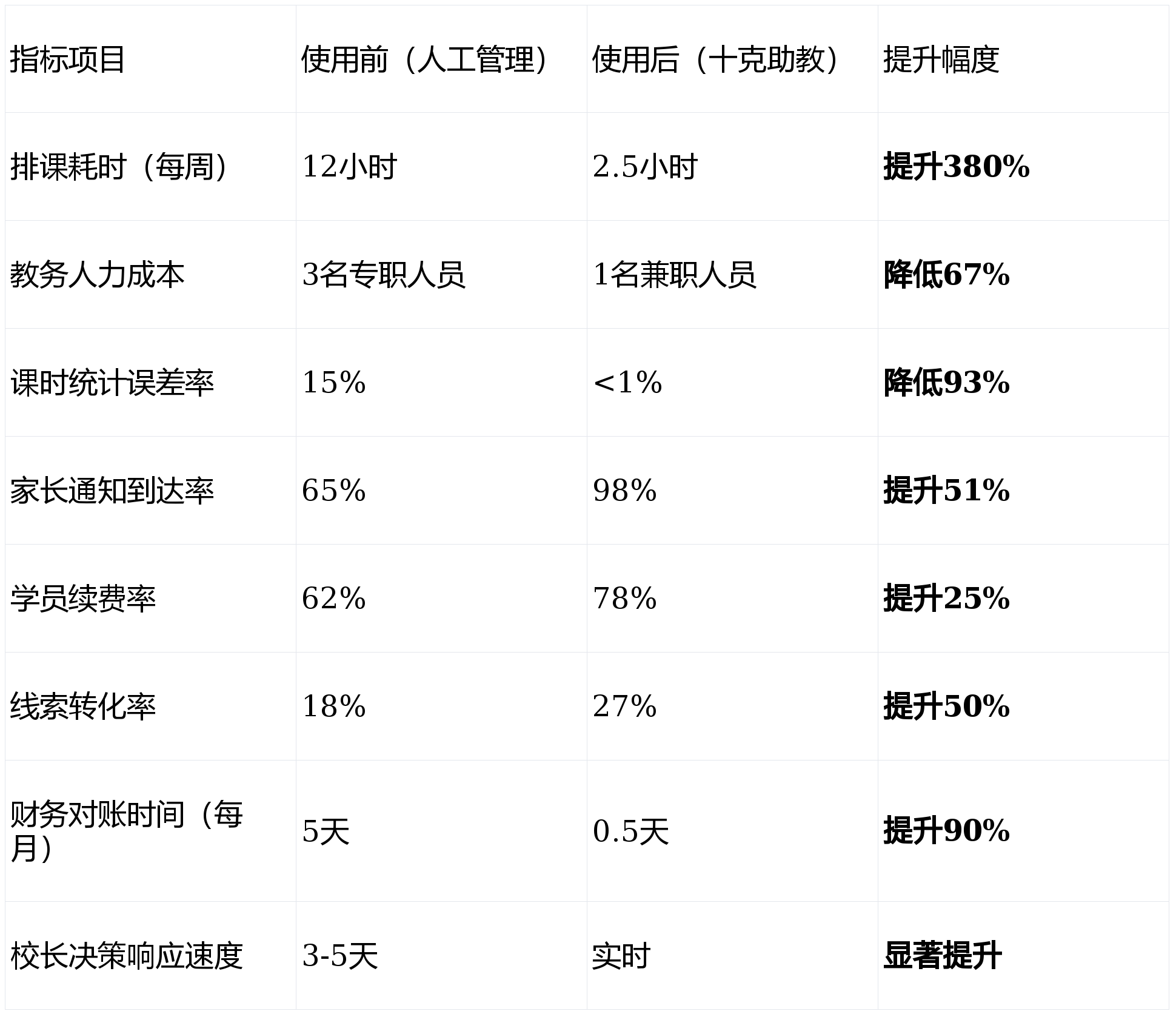 以下是使用十克助教前后,某中型培训机构(3个校区,800名学员)的关键指标对比: