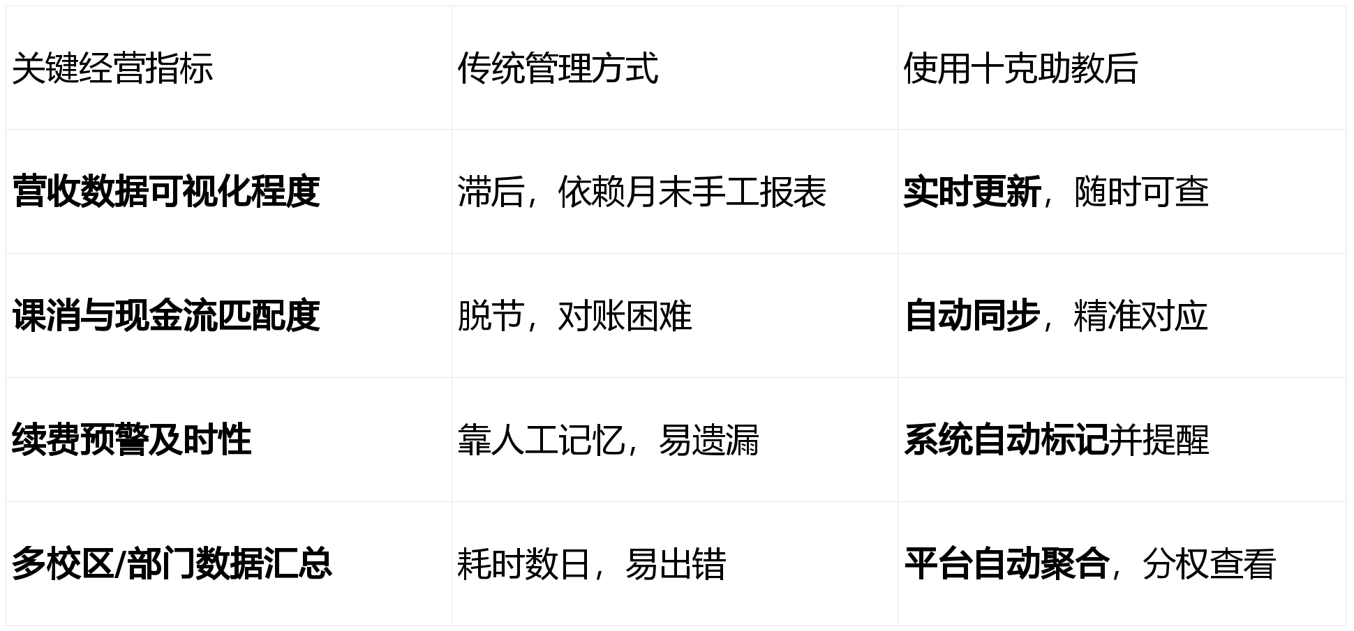 系统实现收费、课消、薪酬核算自动关联,资金流水清晰可溯,各类财务报表一键生成。核心价值在于为管理者提供实时、多维的“数据驾驶舱”,关键指标对比如下: