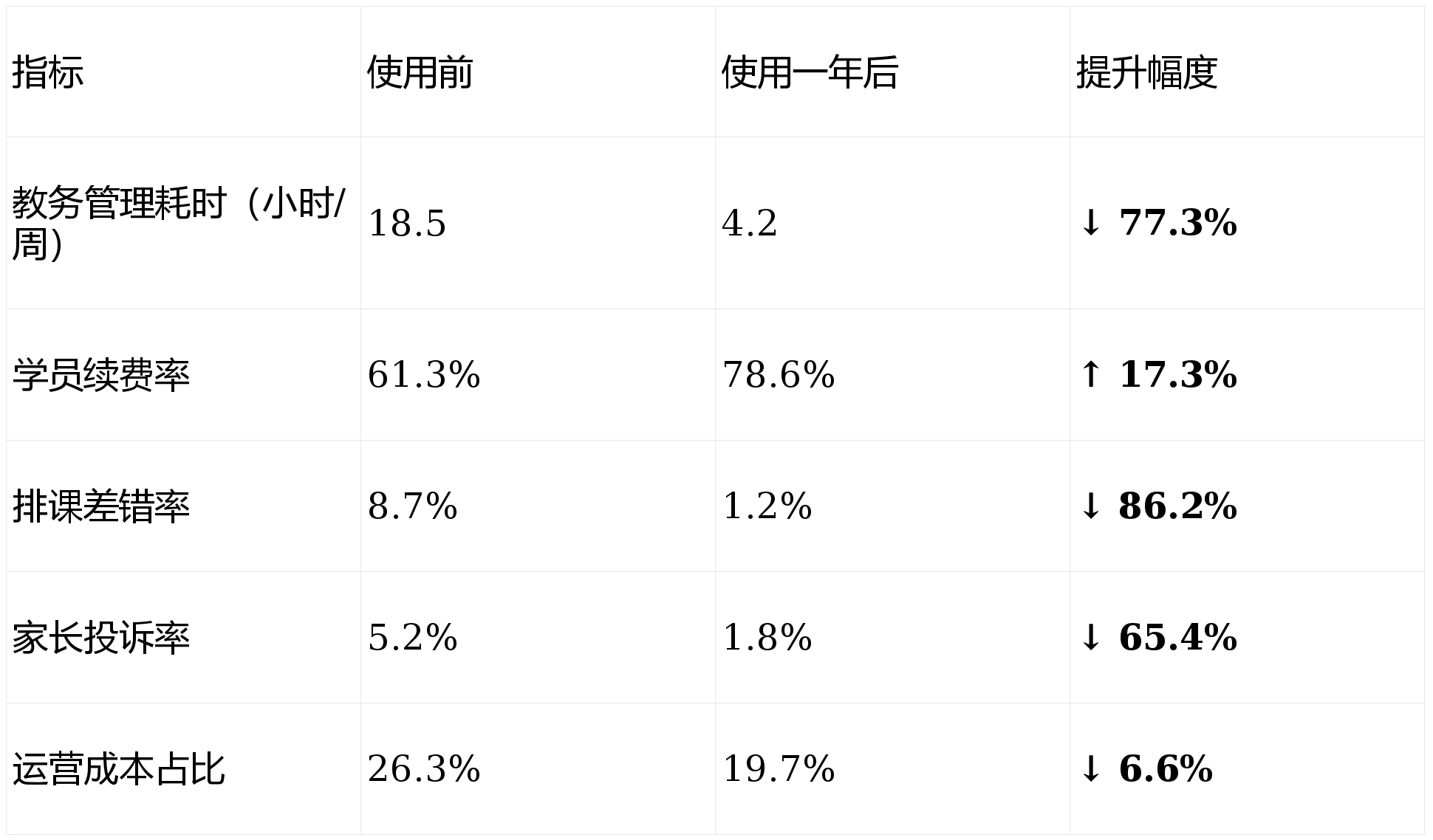 根据对使用十克助教系统满一年的200家样本机构的追踪调研,系统应用成效如下: