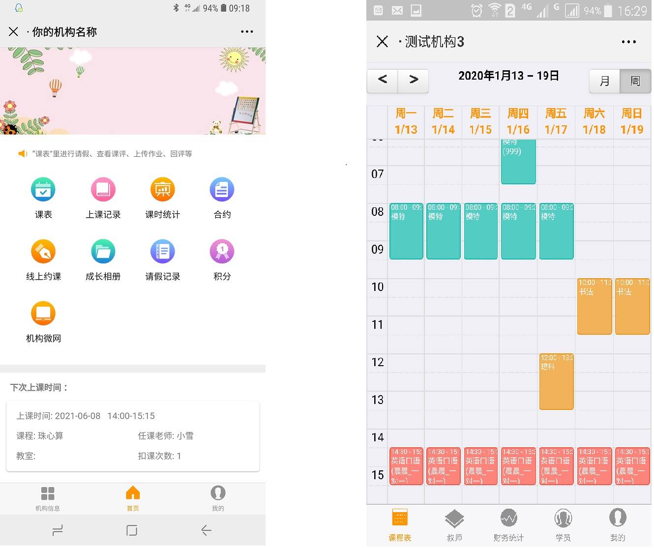 机构后台管理系统:智能排课/线上约课,人脸打卡签到,多种微信通知、提醒,财务中心/结算汇总,学员管理/学员档案、积分,合约管理/续费预警,多校区管理/角色权限管理;